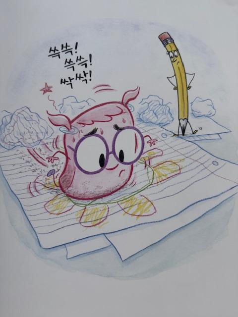 책의 표지에는 핑크빛 지우개가 등장합니다. 귀여운 안경을 끼고, 당당한 포즈를 취하고 있죠. 이 지우개는 특별히 성별이 정해져 있진 않지만, 길게 묶은 머리 덕분에 저는 자연스레 ‘지우개 양’이라 불렀습니다. 아이들도 ‘지우개 언니’라고 부르며 정겹게 다가가곤 하죠.