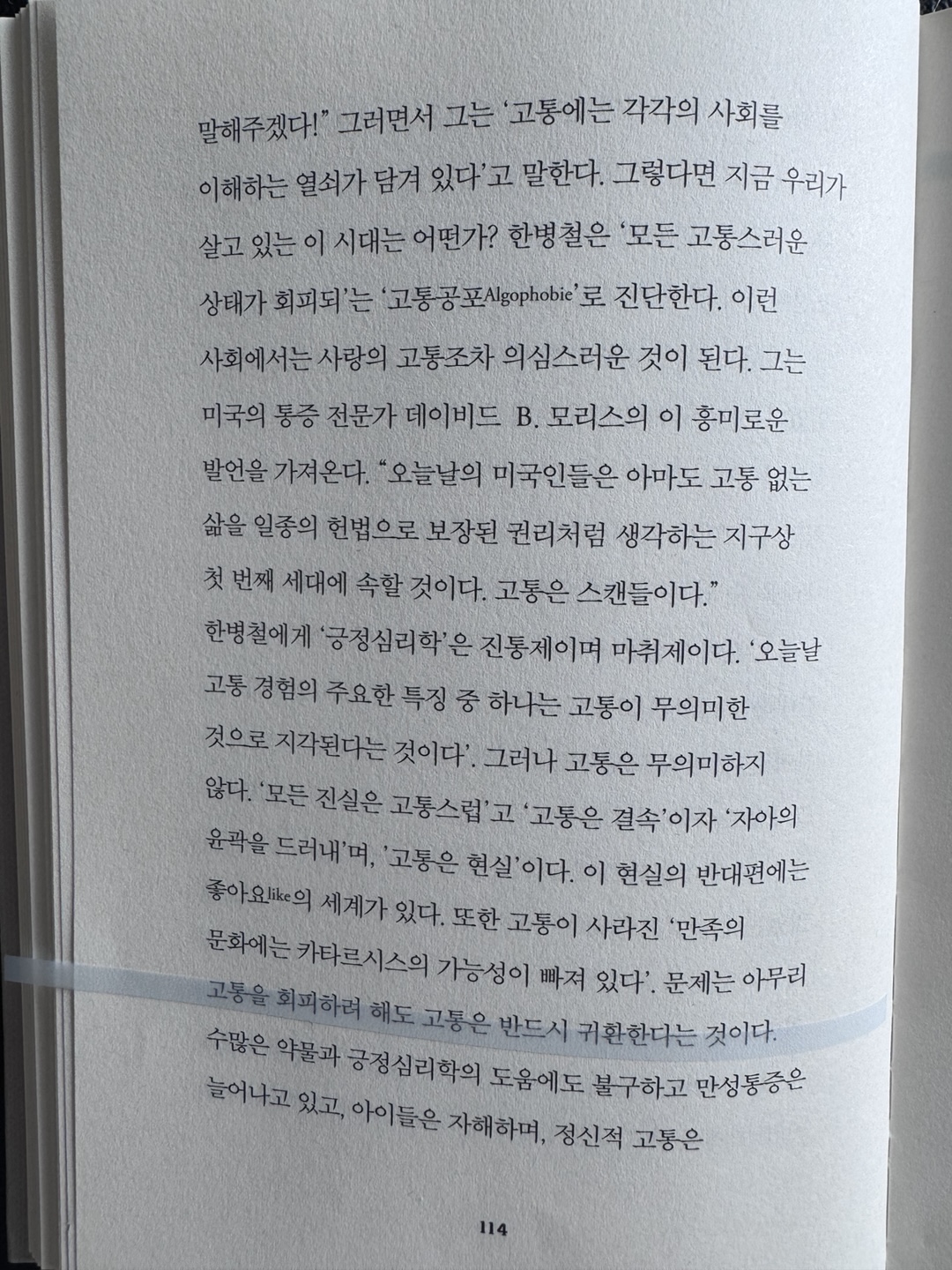 “네가 고통과 어떤 관계를 맺고 있는지 말하라, 그러면 네가 누구인지 말해주겠다.” 에른스트 윙어의 말을 인용한 한병철의 논지를 따라, 작가는 말합니다. 고통은 사회를 이해하는 열쇠이며, 고통이 사라진 사회는 의미를 상실한 사회일 수밖에 없다고.