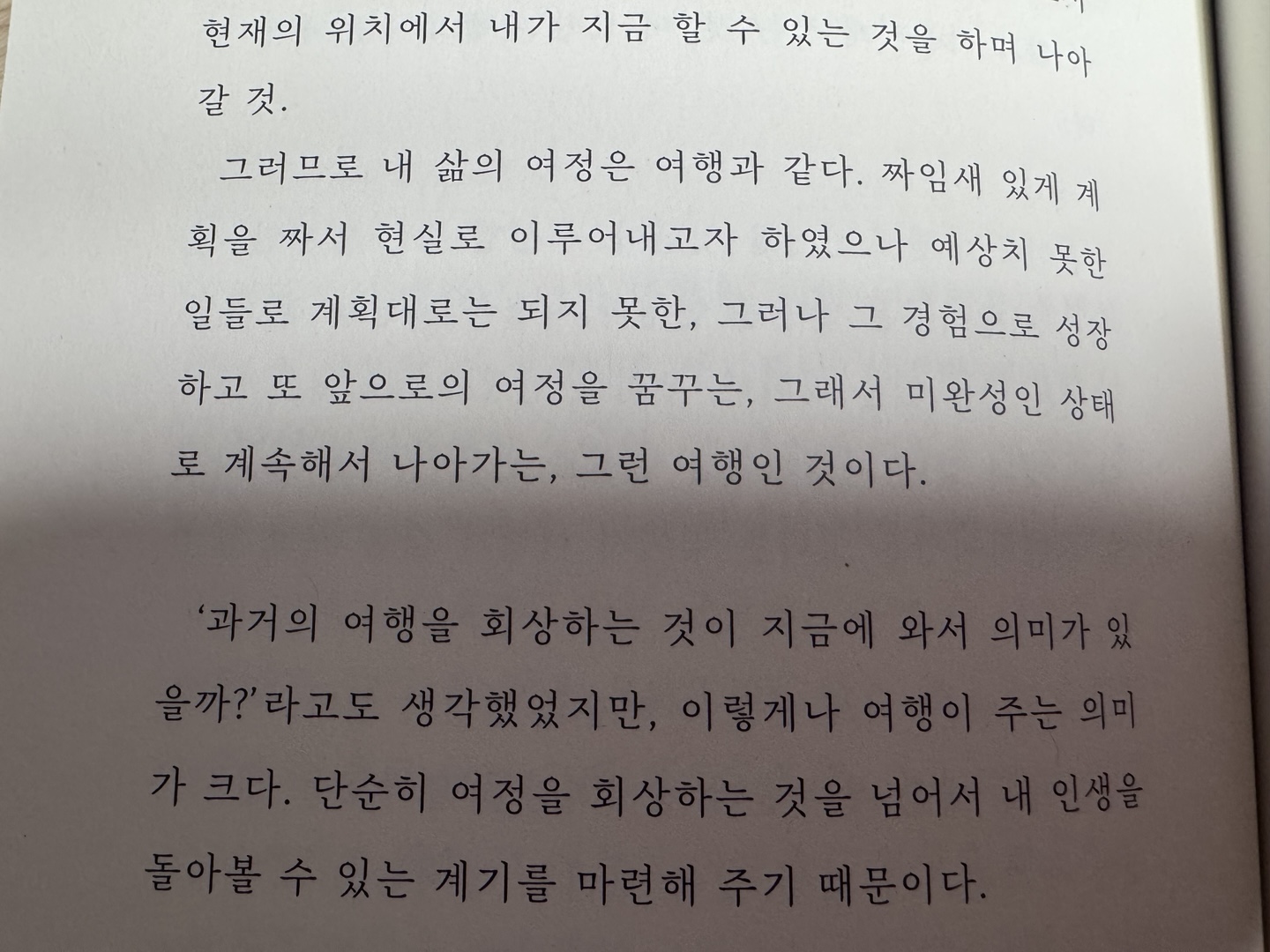 작가는 여행 속에서 마주하는 이 '미완성'의 조각들이 오히려 우리를 성장시킨다는 역설적인 지혜를 전합니다. 여행에서 만난 예상치 못한 변수들, 계획대로 되지 않는 순간들이 바로 우리 삶과 닮아있음을 이야기합니다.